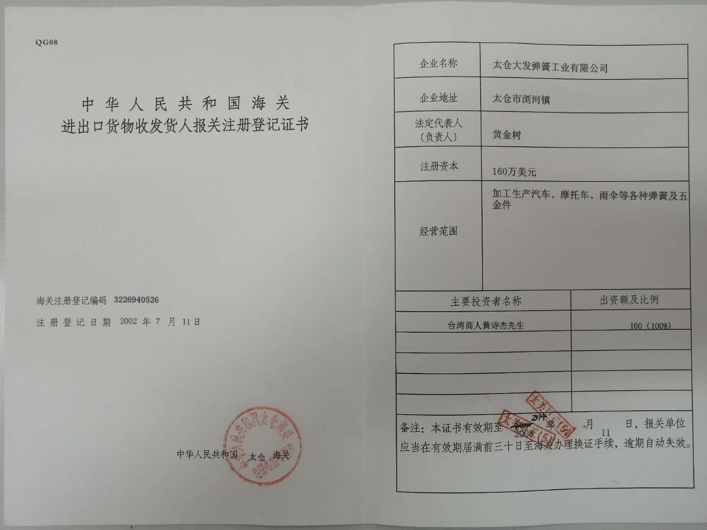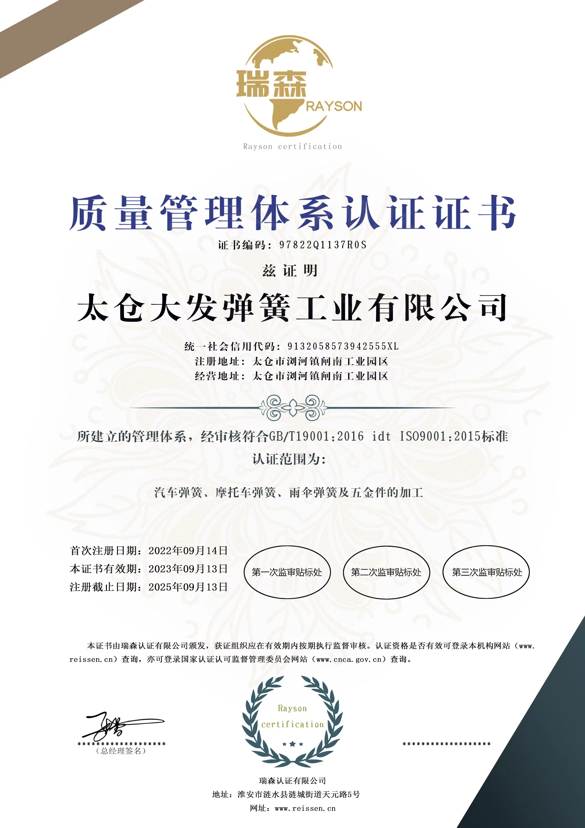 太倉(cāng)大發(fā)彈簧工業(yè)有限公司由黃金樹(shù)先生于1967年始創(chuàng)于臺(tái)灣,是一個(gè)集雨傘、電子、五金機(jī)械、自行車(chē)、摩托車(chē)、汽車(chē)等的彈簧配件生產(chǎn)、加工、輔助設(shè)計(jì)服務(wù)的綜合性企業(yè),其中1990年創(chuàng)辦的廈門(mén)大發(fā)彈簧公司、2000年創(chuàng)辦的深圳大發(fā)彈簧公司、2002年創(chuàng)辦的太倉(cāng)大發(fā)彈簧公司均位于經(jīng)濟(jì)發(fā)展地區(qū),地理位置佳。我們憑借在彈簧制造業(yè)的多年豐富知識(shí)與技術(shù),并著眼于以客戶為導(dǎo)向,秉持“以人為本,以質(zhì)為先,以客為主,持續(xù)創(chuàng)新”的經(jīng)營(yíng)理念,強(qiáng)化競(jìng)爭(zhēng)優(yōu)勢(shì)。公司導(dǎo)入ISO9001: 2000質(zhì)量管理體系,執(zhí)行ISO14000:2000管理方式,倡導(dǎo)安全、高質(zhì)量、高素質(zhì)的生產(chǎn)。